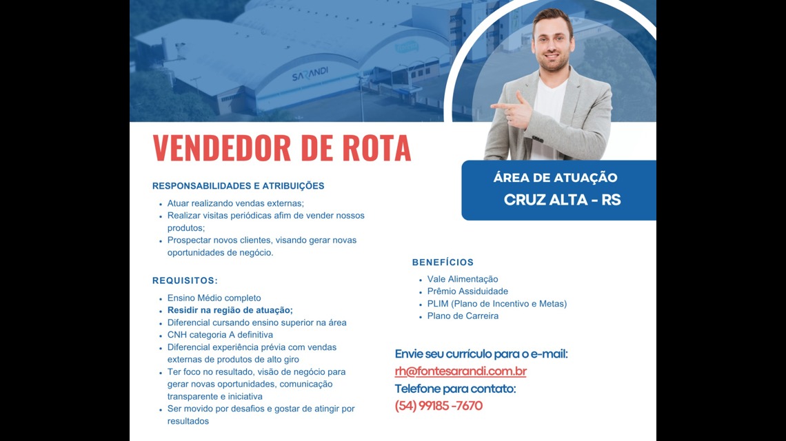 Como Vendedor de Rota, você será responsável por visitar clientes regulares e potenciais, apresentar nossos produtos e serviços, fechar negócios e garantir a satisfação do cliente.