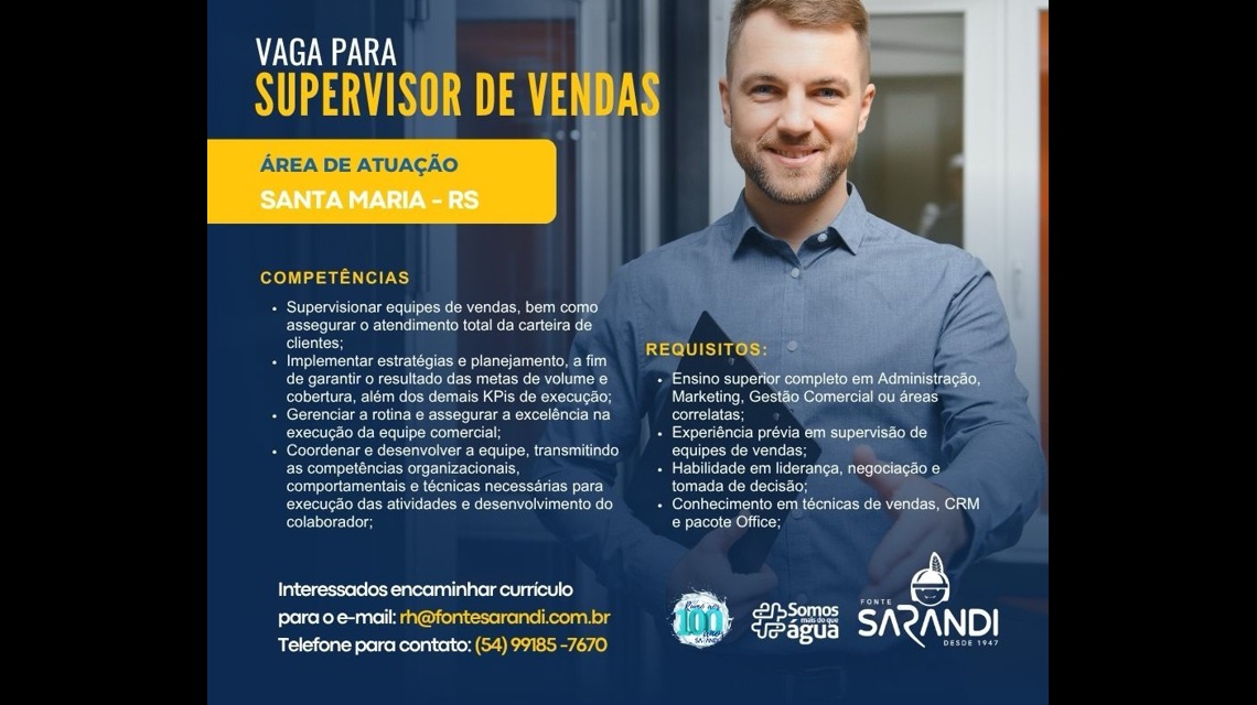 Estamos em busca de um profissional dinâmico e experiente para assumir o papel de Supervisor de Vendas na Fonte Sarandi.